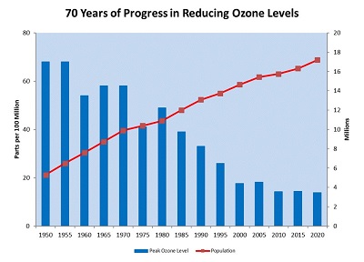 Air quality in this area has continually improved despite an enormous increase in population and cars. For example, maximum levels of ozone, one of our worst smog problems, have been cut to less than one quarter of what they were in the 1950s, even though today we have nearly three times as many people and four times as many vehicles.