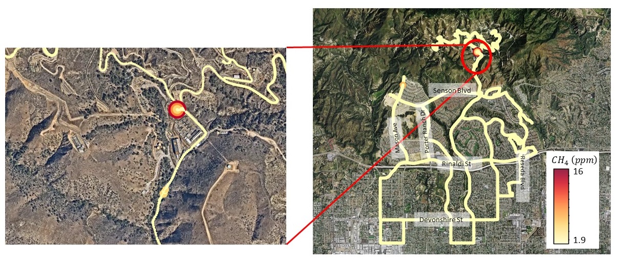 In response to more than 100 odor complaints in the area, South Coast AQMD conducted mobile methane measurements in and around the Porter Ranch Community and within the SoCalGas Aliso Canyon facility. The mobile monitoring showed methane measurements to be within typical background levels. One elevated methane reading was detected inside the SoCalGas facility near the main office area. Further investigation confirmed that this was a short-term peak and was not the result of an ongoing leak or the source of the odor complaints. Results from the mobile monitoring can be found in the Figure below.