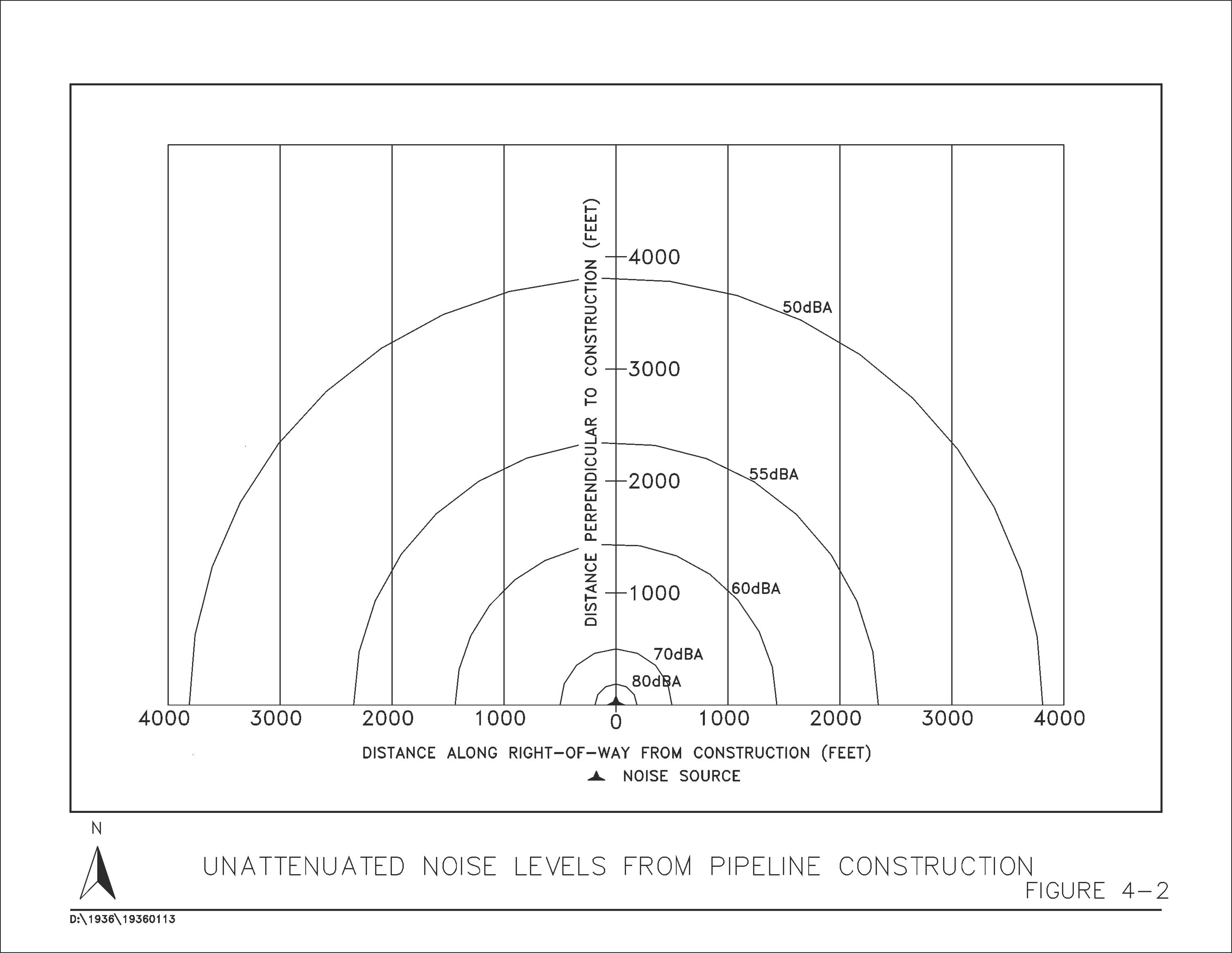 Chapter 4 - Environmental Impacts and Mitigation Measures (PDF, 519KB) Figure 4-1: Project Maximum Impact Locations (JPG, 1.4MB) Figure 4-2: Unattenuated Noise Levels from Pipeline Construction (JPG, 307KB)