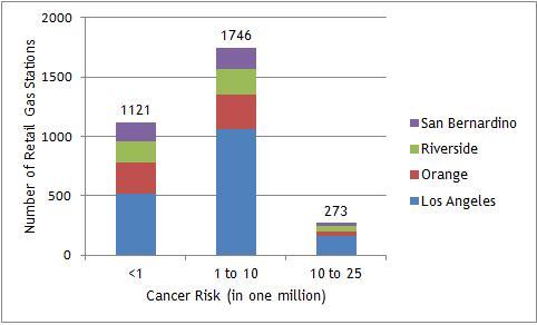 Dispersion modeling was performed for the 3,140 retail gasoline dispensing facilities using the U.S. EPA model called Industrial Source Complex (version 3) and relying on meteorological data collected at 35 stations in the Basin. The cancer risks from the stations were estimated using the procedures outlined above and the results are summarized in Figure 1. A more detailed discussion of the methods is available in the Health Risk Assessment for Gas Stations (PDF, 828kb) .
